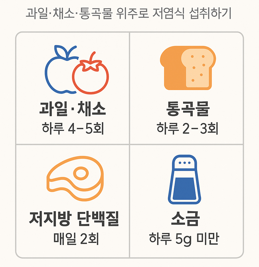 - 소금 섭취 줄이기 (1일 5g 이하 권장)